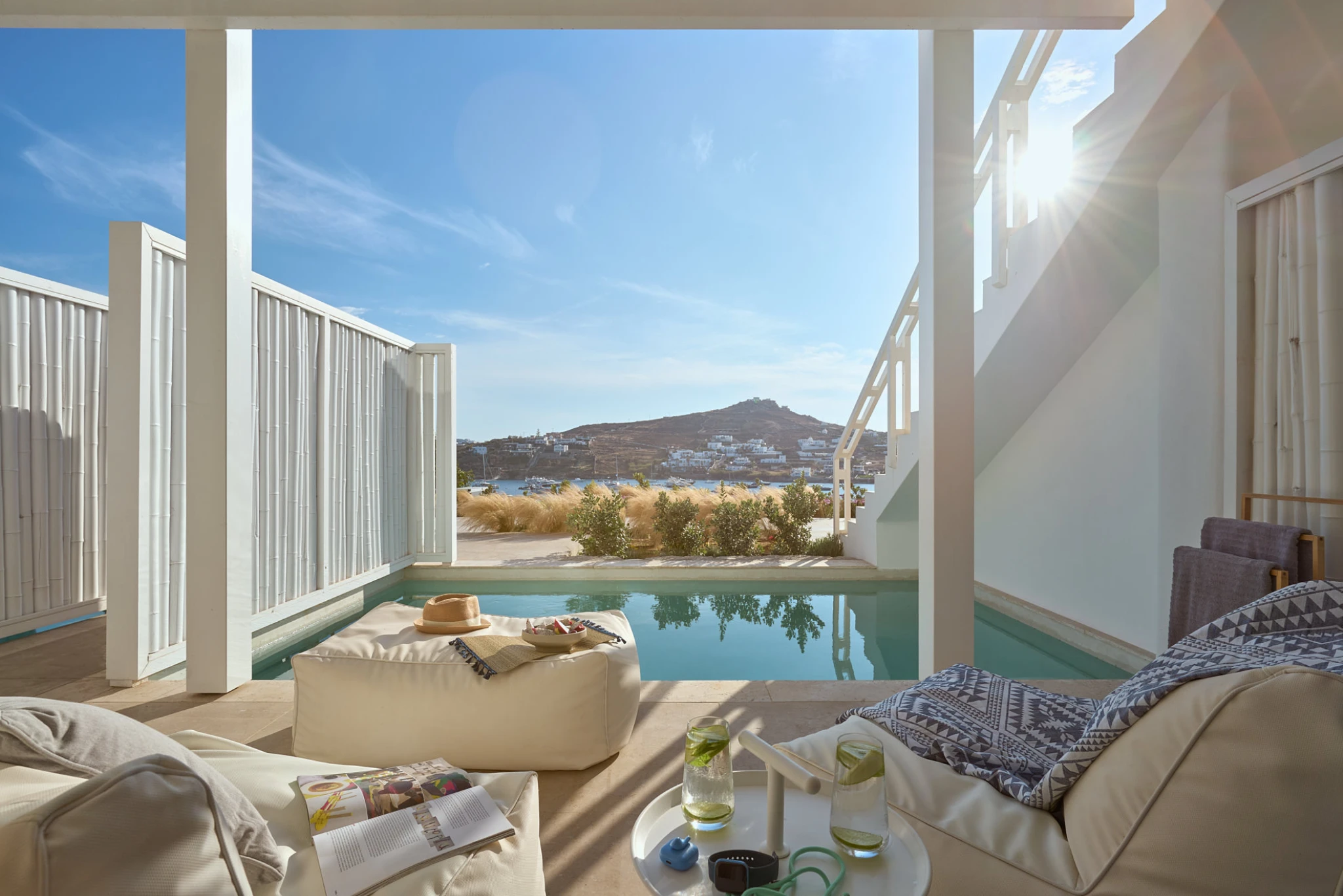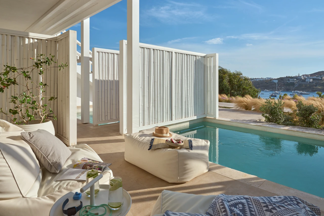 A design gift of luxury hospitality with Mykonian glam for two. Every moment here is an indulgence and every corner the reassurance of a marvelous stay! From waking up to the glint of the Aegean Sea that beckons from the window to enjoying the tranquil surrounds of this 27 sqm room and your private chill out pool with sunbeds, every day is a celebration to luxury and premium hospitality. This includes a King Size bed, a spacious bathroom and Frederic Malle amenities, a writing desk, a Nespresso machine, a tea making tray, a 49’’ TV and a minibar.