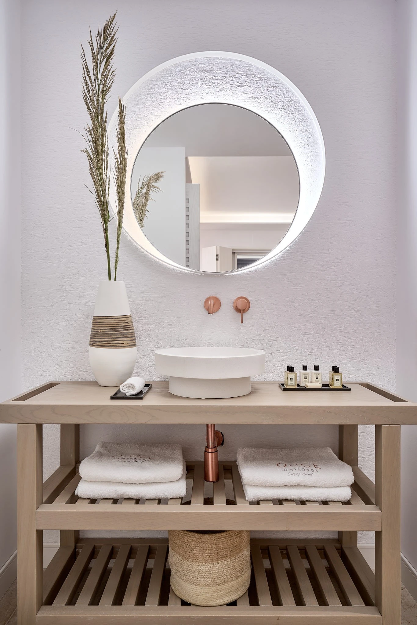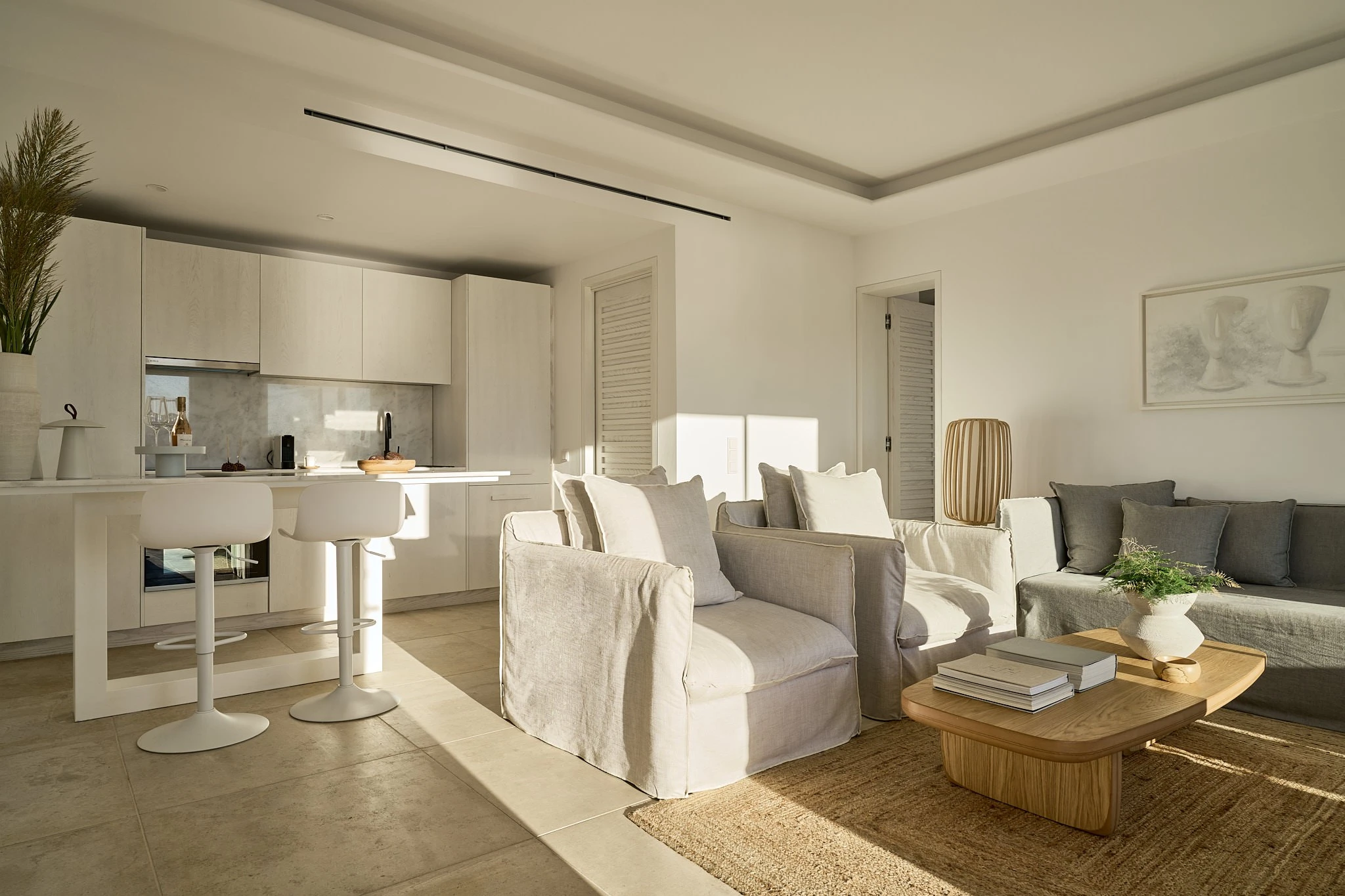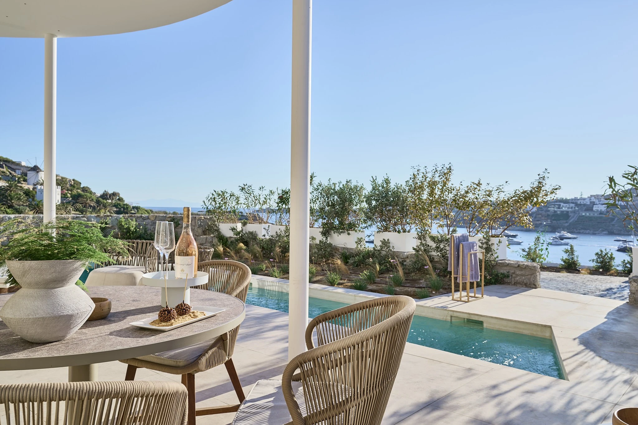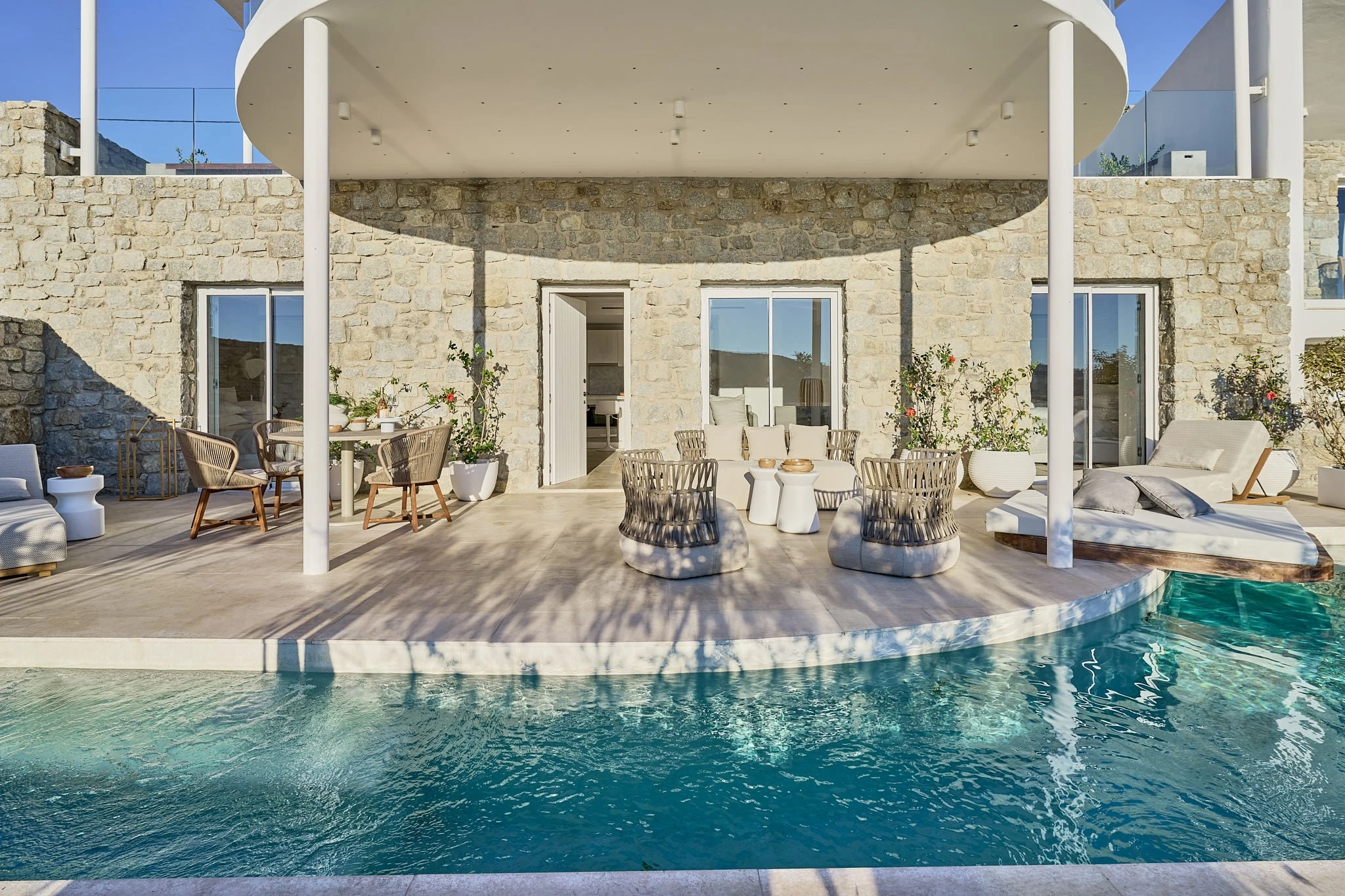 Immerse yourself in endless views of the soothing Ornos beach available from your 50 sq.m. veranda with an exquisite 30 sq.m. pool and a magnificent outdoor lounge area with sunbeds, the perfect spot to soak up sunrises and sunsets. The oversized 105 sq. m. villa features two bedrooms with two King size beds and two bathrooms, a fully equipped kitchen and a WC in the living room, as well as a writing desk and three 49’’ TVs, a Nespresso machine, a tea-making tray, Frederic Malle amenities and a minibar.