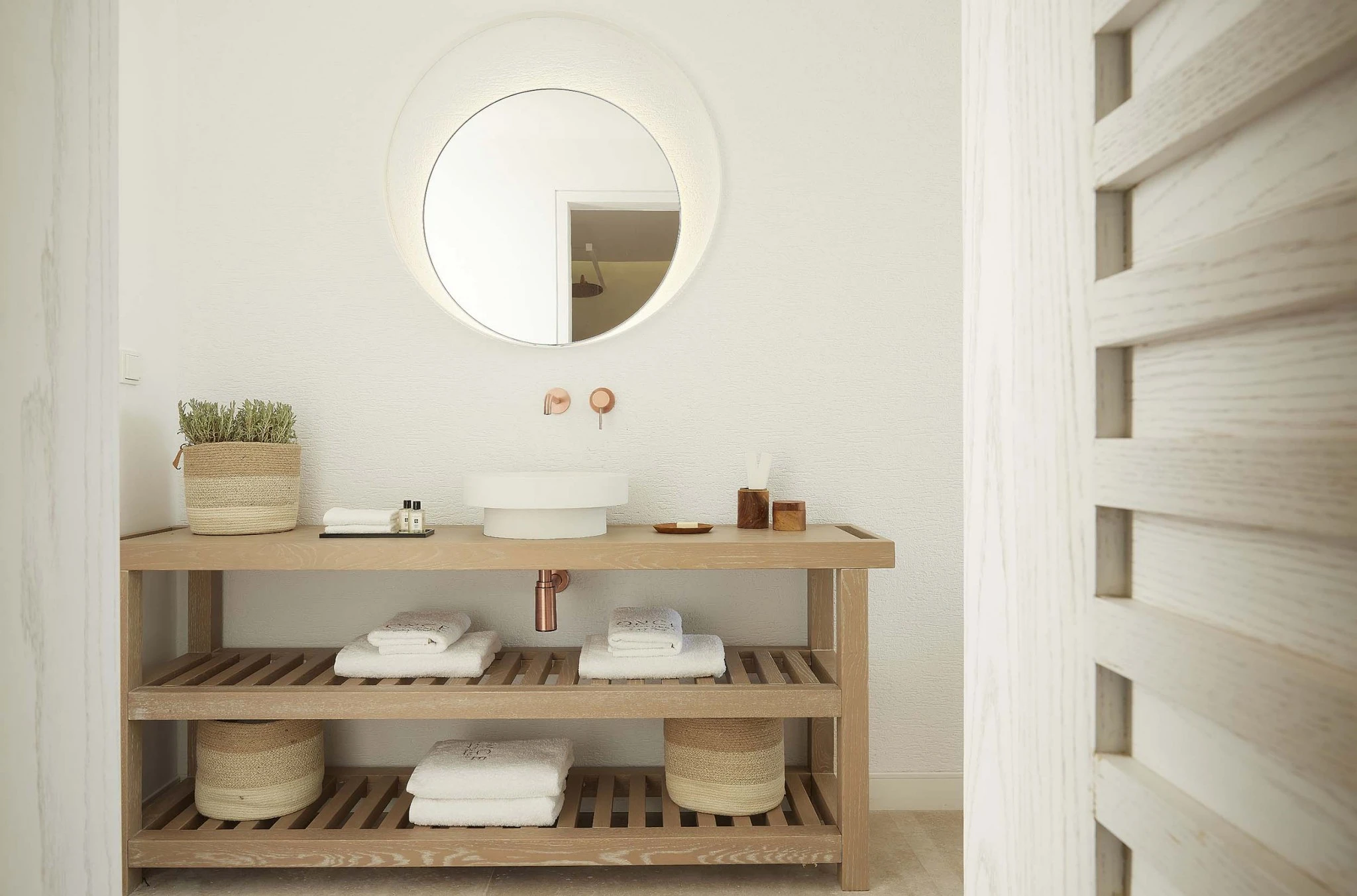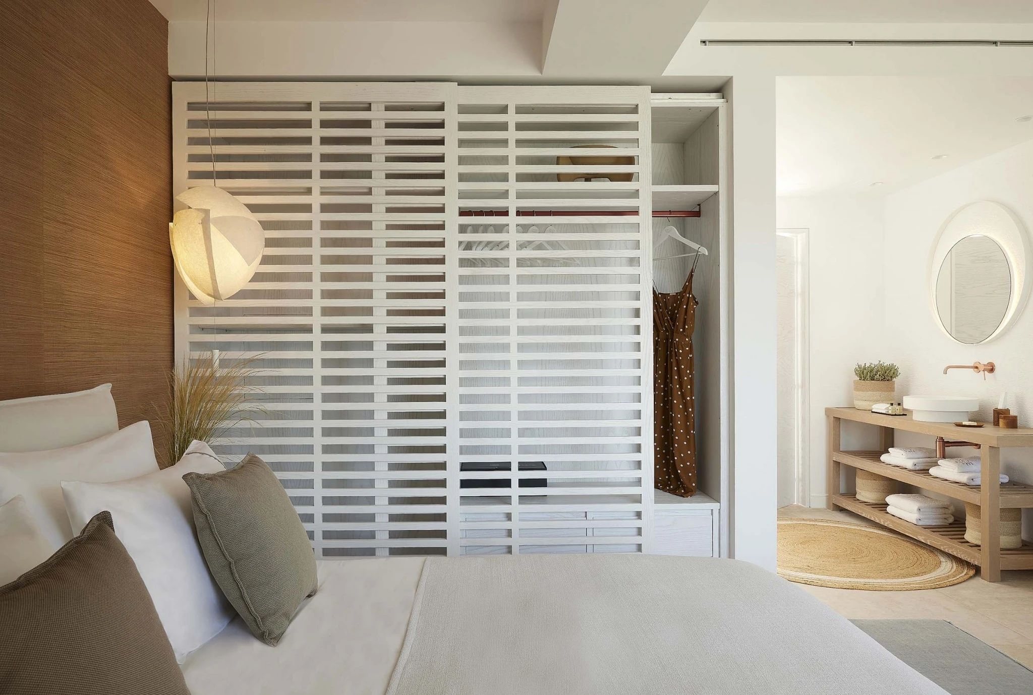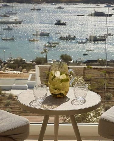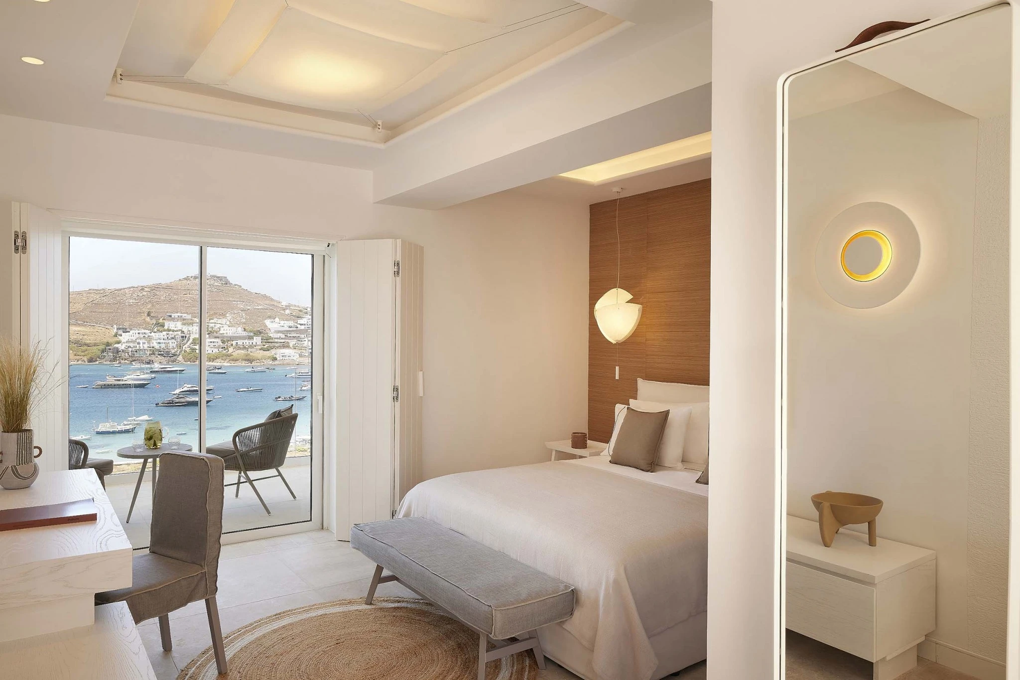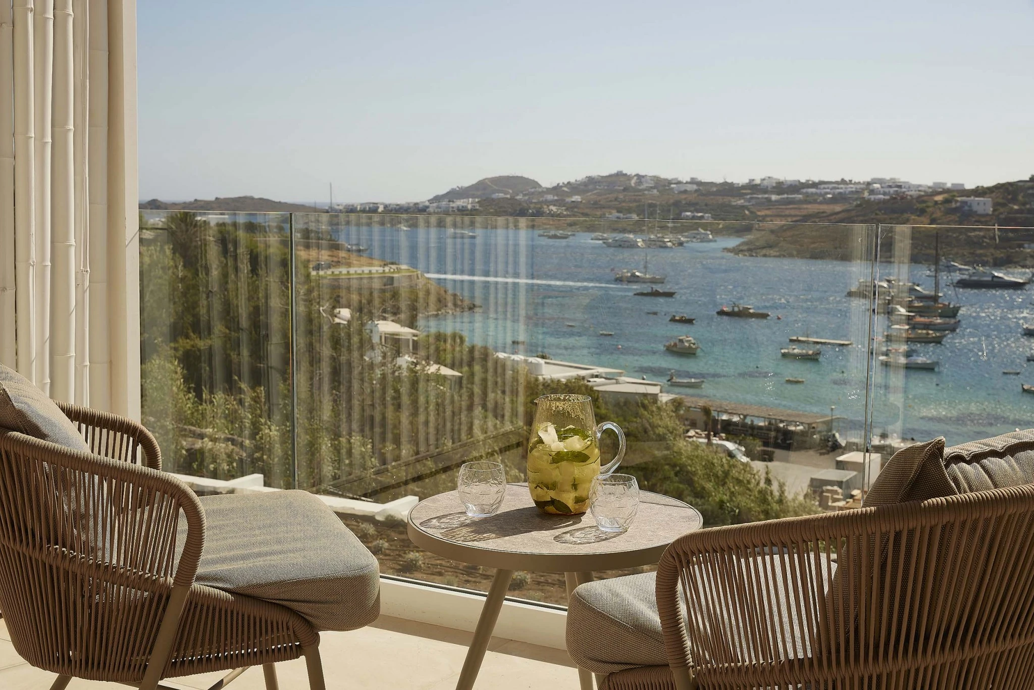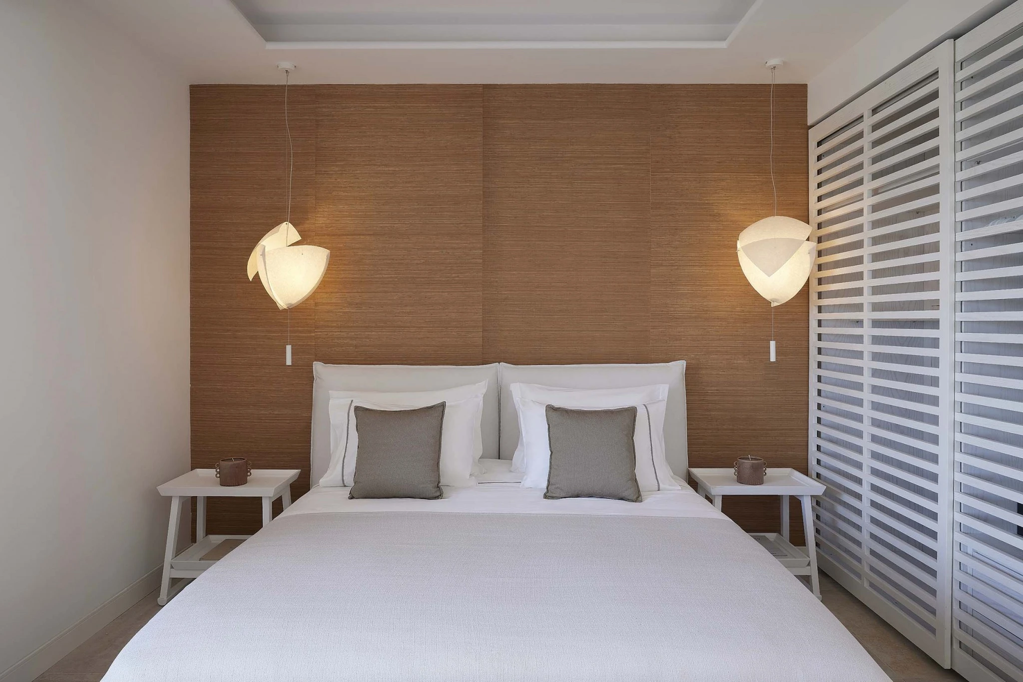 An idyllic Mykonian experience with a mythic touch. From the first moment in the 24 sqm room, you will be taken by the panorama of the bustling Ornos beach. The glamorous past is discreetly infused in every corner of the room enriching plush furnishings, modern amenities and touches of Cycladic style. Surrounded by whitewashed colour tones, the room with a Queen Size bed, a writing desk, a Nespresso machine, a tea making tray, a 49’’ TV, Frederic Malle amenities and a minibar boasts seamless indoor and outdoor living for two persons with exquisite balconies to savor the breathtaking view unfolding in front of you.
