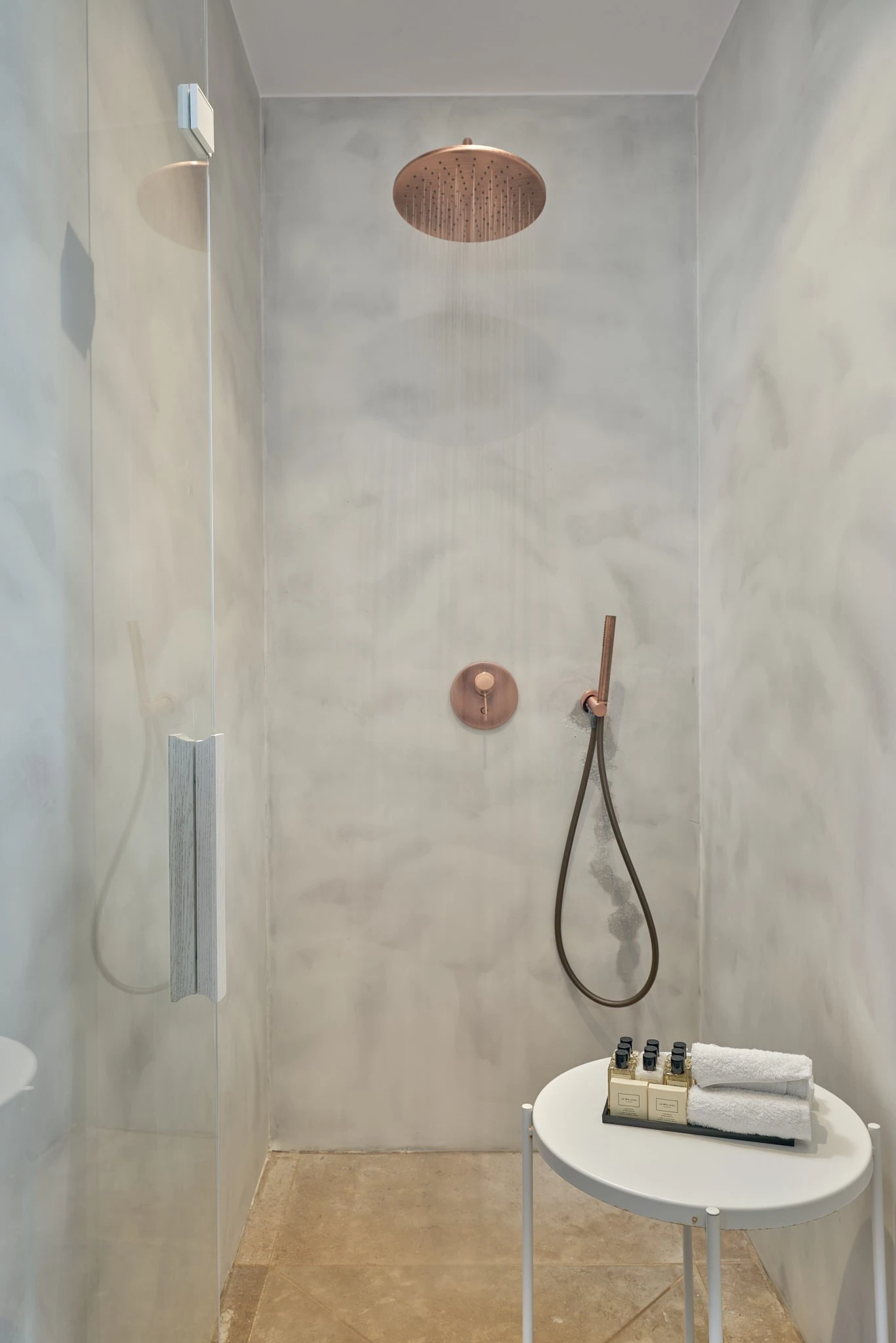 Feel privileged and pampered at the best spot of Ornos beach. Plunge into that effortless summer living and feel privileged to enjoy a magnificent panoramic view in your own outdoor jacuzzi for two. From your bright and airy terrace, indulge in a refreshing hydromassage while enjoying endless sea views. The 28 sqm room’s services, such as a King Size bed, a writing desk, a Nespresso machine, a tea making tray, a 49’’ TV, Frederic Malle amenities and a minibar tend to satisfy your every need while you ease yourself into island life.